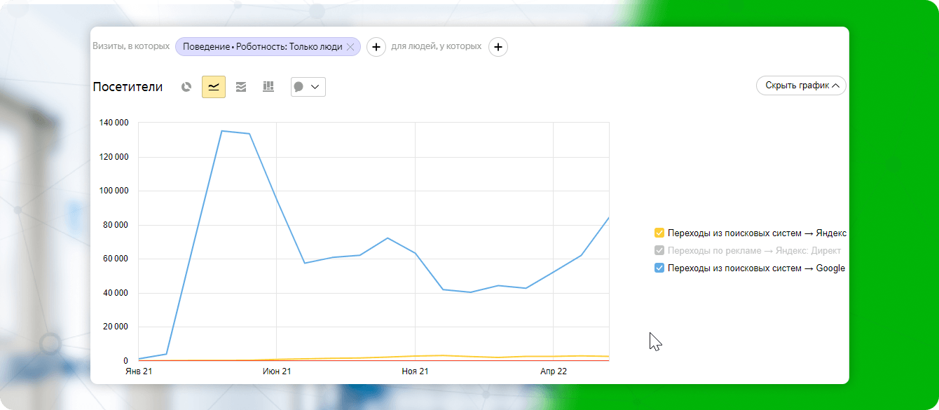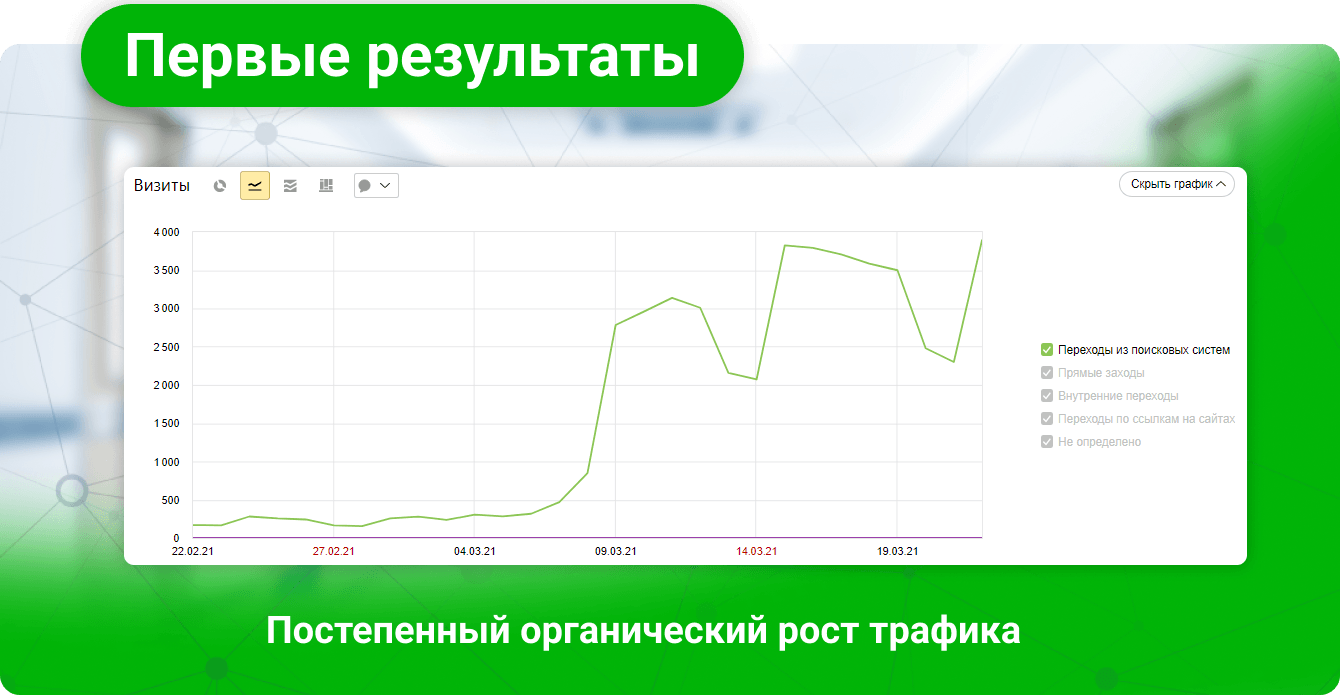 Теперь, после проделанных работ, мы наблюдали постепенный органический рост трафика: