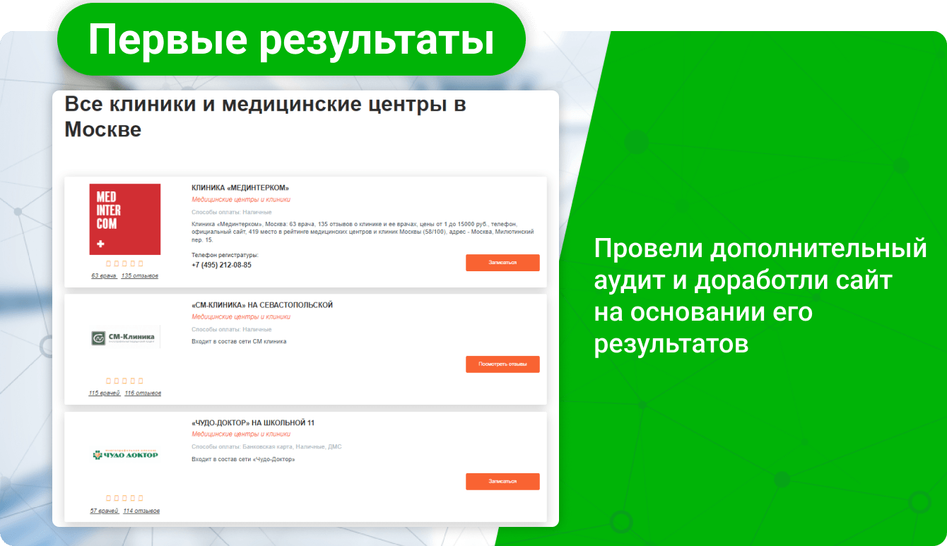 По сути получилась следующая картина — пользователи массово заходили на страницы врачей и клиник, где не могли ни позвонить, ни оставить заявку на запись. После этого, конечно же, они уходили обратно в выдачу, из-за чего сайт сильно терял в метриках по ласт клику.