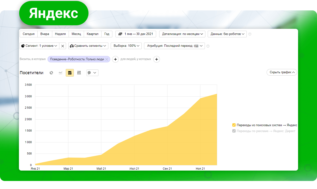 Таким образом, Яндекс не давал резкого роста, а просто плавно наращивал трафик на сайт даже несмотря на то, что мы отключили заявки. В пике удалось выжать только 3000 посетителей в месяц: