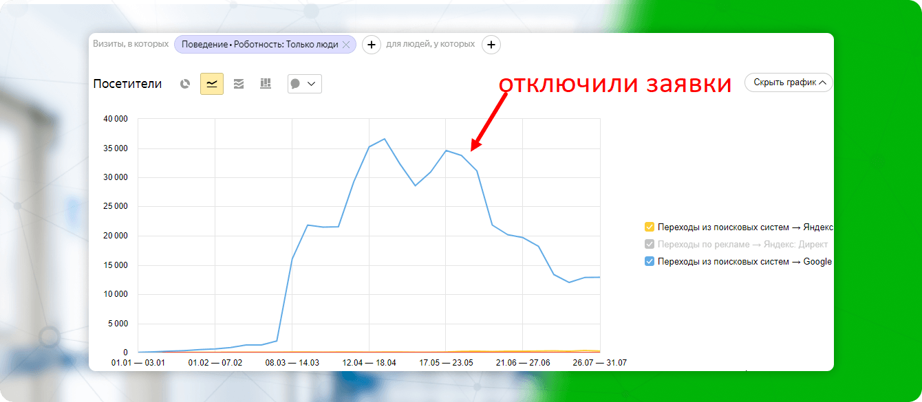 Если трафик падает, нужно что-то предпринимать. Мы не могли вновь вернуть заявки в ближайшее время, но трафик падал, а клиент по-прежнему ожидал от нас роста. Мы решили дальше работать с внутрянкой сайта, чтобы оживить его, т.к. была вероятность возобновления работы с заявками.