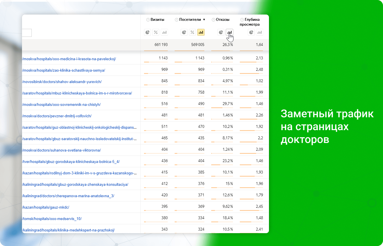 На момент работ над сайтом среди специалистов нашей студии не было однозначного мнения, что в Яндекс (а теперь уже и в Google) нужно добавлять в индексацию не весь сайт сразу, а понемногу. Весь основной трафик приходился на карточки врачей. Каждая страница собирала немного трафика, но так как их было очень много, трафик собирался внушительный и наблюдался постепенный рост СЧ и ВЧ запросов.