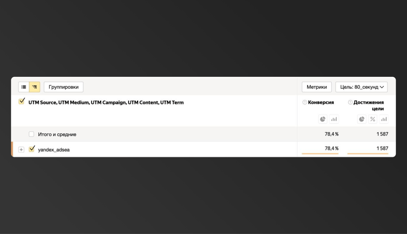 Доля вовлеченных пользователей с длительностью визита более 80 секунд — 78,35%. То есть 8 из 10 посетителей с рекламы скроллили, кликали, печатали на сайте больше 1,3 минут.