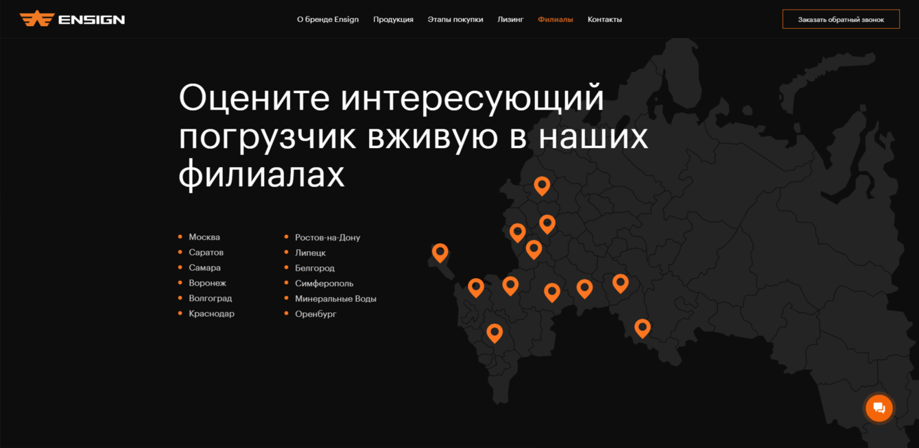 Важно было показать, что у компании много филиалов по России. Отобразили это в виде минималистичной карты. Названия городов разместили под заголовком, а адреса «спрятали» в оранжевые маркеры на карте. Так мы не перегружаем пользователя лишней информацией.