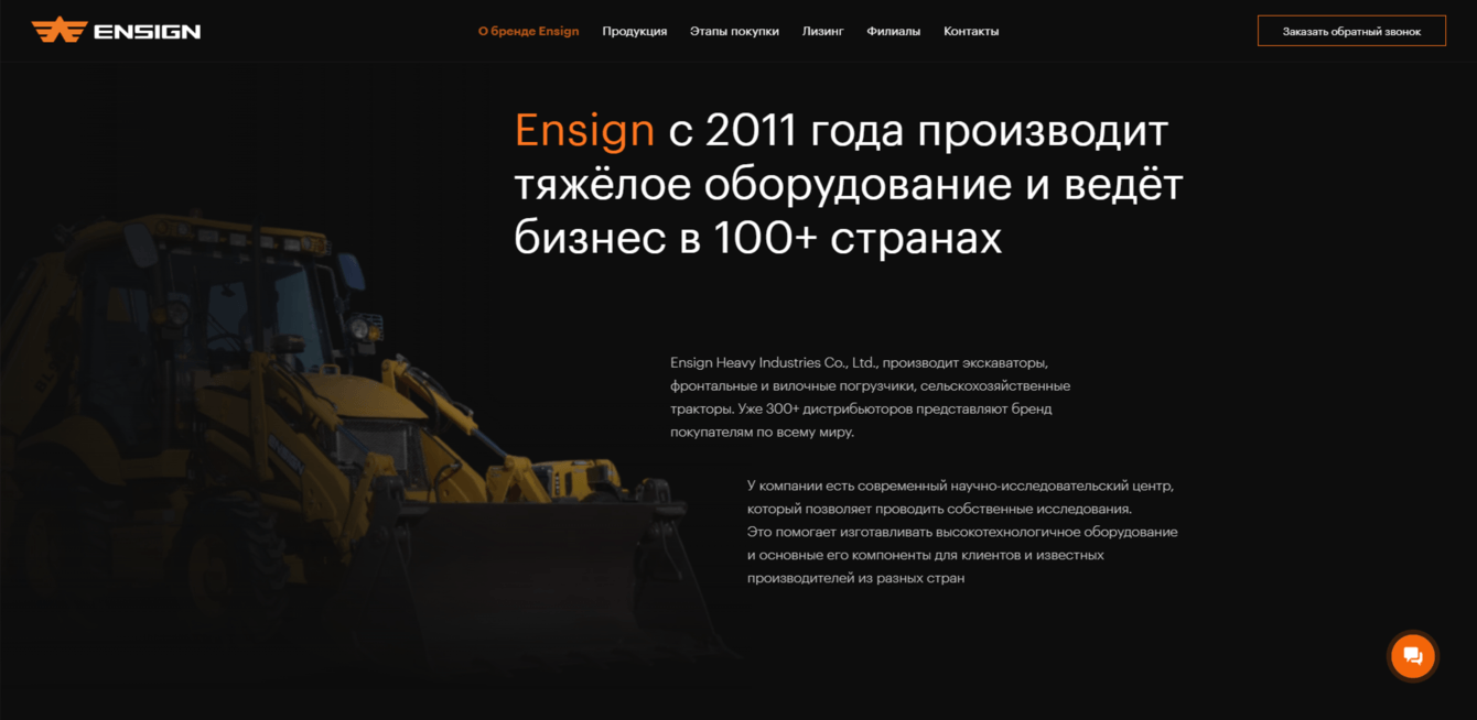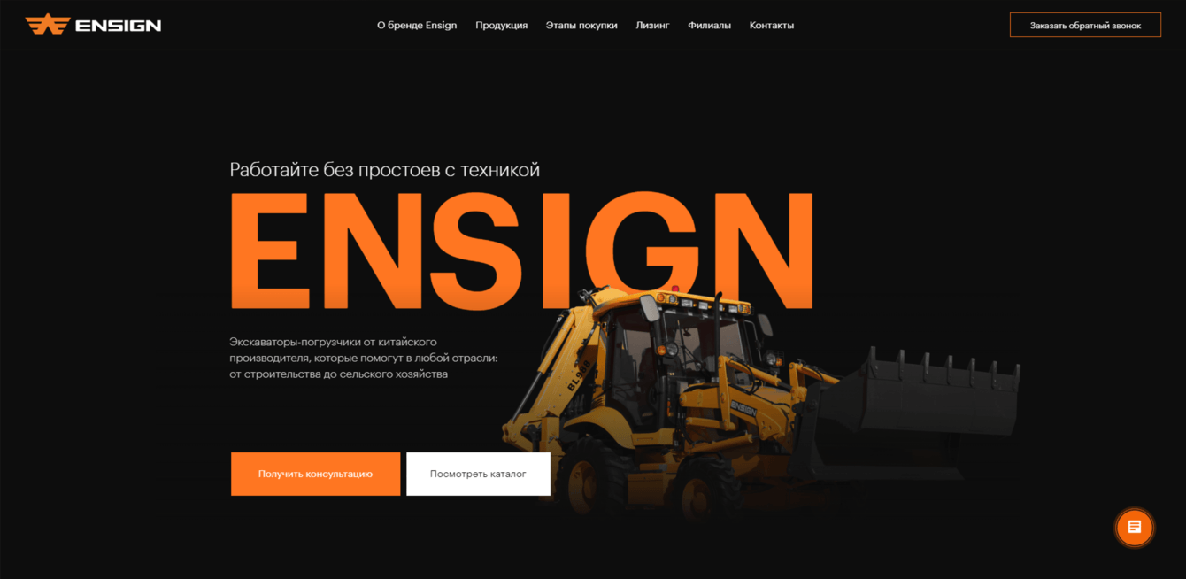 Первое, что бросается в глаза на главном экране — название бренда. Мы выделили Ensign в заголовке с помощью крупного шрифта и акцентного оранжевого цвета. Рядом разместили модель экскаватора-погрузчика от бренда. Так ещё до прочтения текста считывается, что продаётся на сайте.
