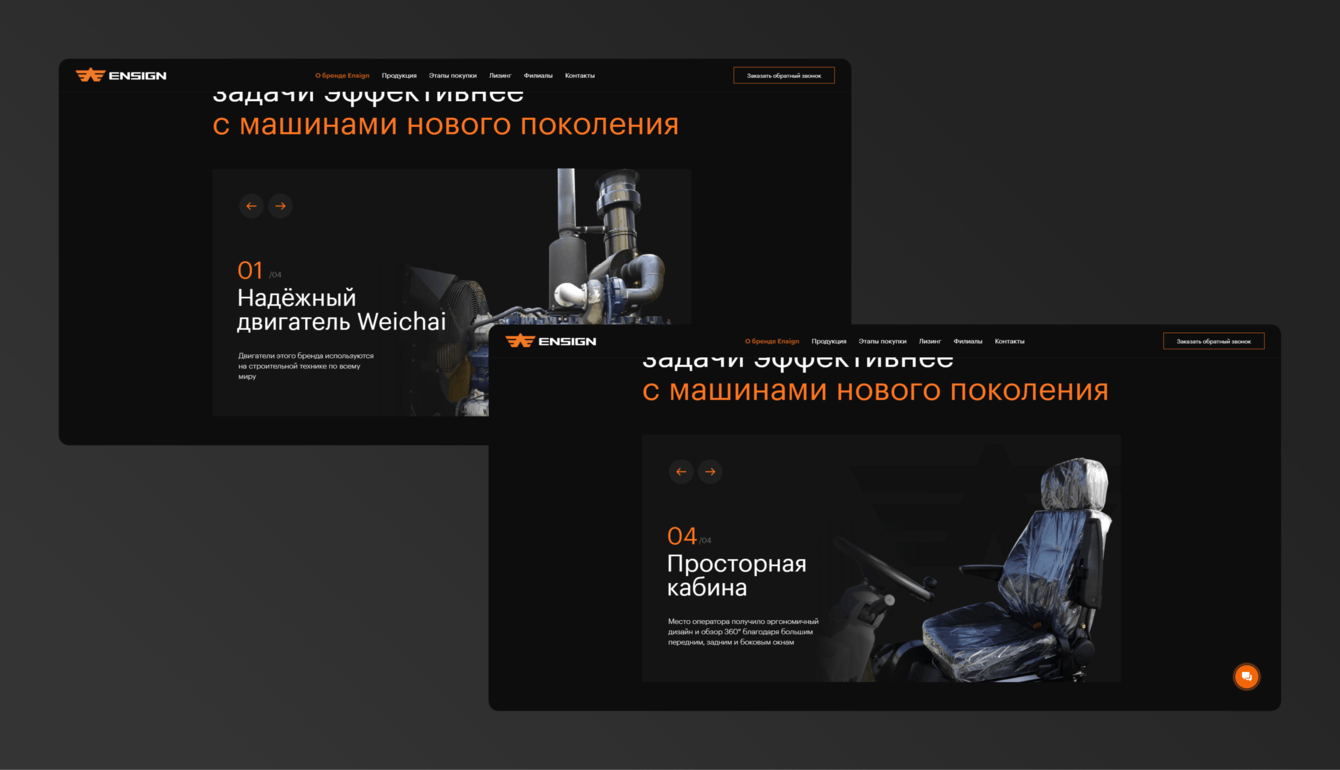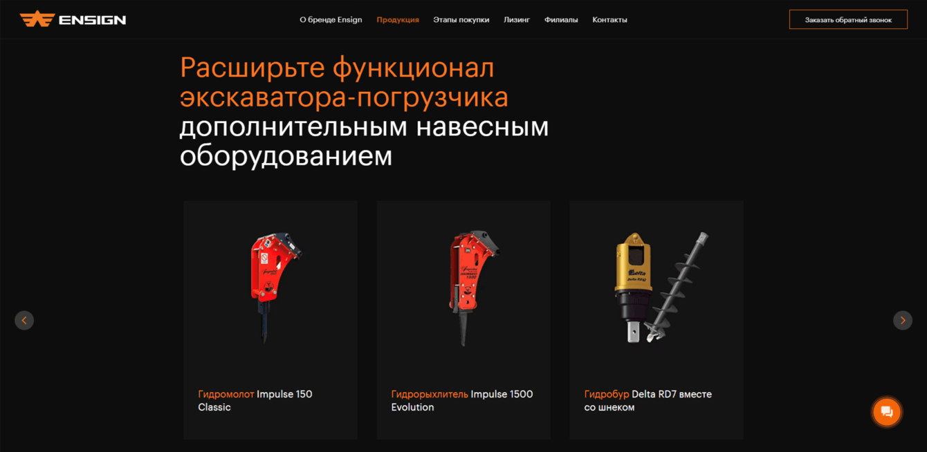Мы разобрались, кто такие Ensign, а в чём плюсы техники бренда? Сразу после блока о компании говорим, чем хороши экскаваторы производителя. Все преимущества подкрепили изображениями, чтобы не просто рассказать о них, но и наглядно показать. Контент на блоке упаковали в слайдер, чтобы подать плюсы компактно и не растягивать скролл.