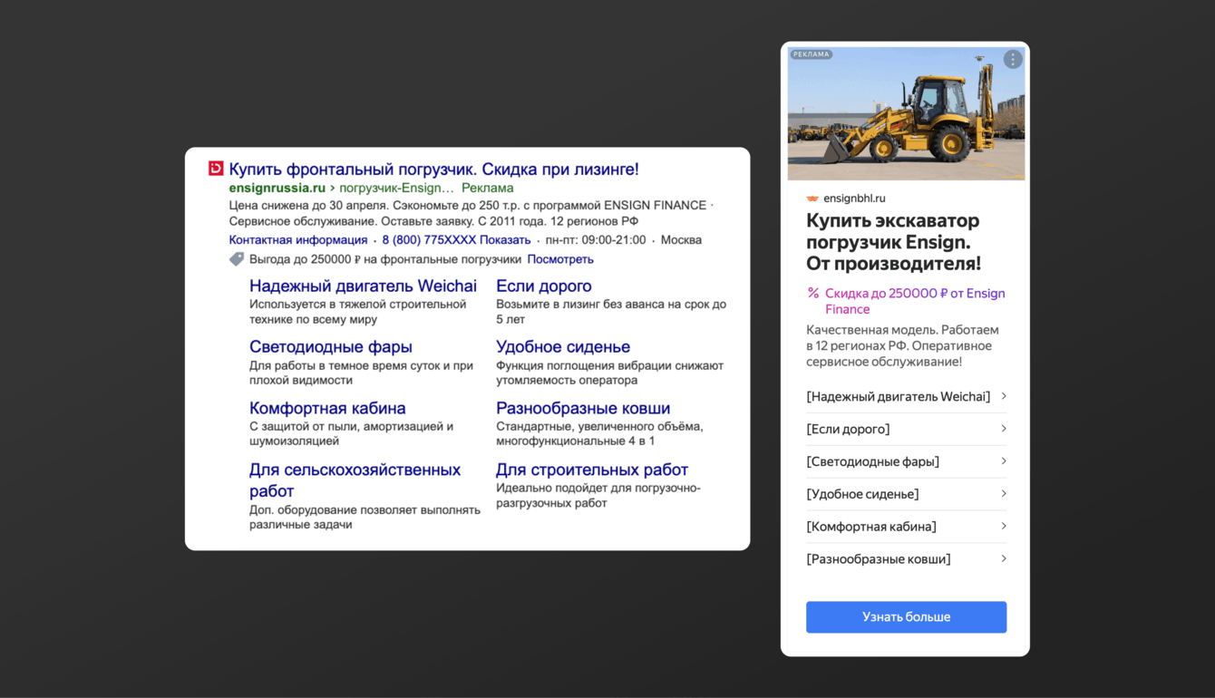 И запускали продвижение через РСЯ. Это те самые объявления, которые видно на сайтах, где есть блоки под рекламу. Работает оно так: человек вчера искал информацию про покупку спецтехники, а сегодня зашёл на Яндекс.Погоду и увидел там объявление про экскаваторы Ensign.
