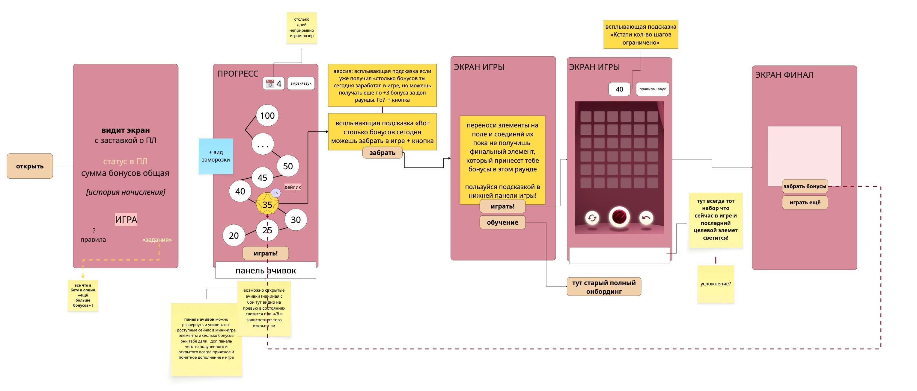 В изначальном варианте верхнеуровнево предложенный юзерфлоу подразумевал вход в мини-игру, как основную цель — сразу с главной, а экран прогресса скорее сделать доп мотивацией для конкретного типа игроков. Решили проверить, какой процент девушек будет следить за своим прогрессом и будет ли им важно удерживать получение всё большей и большей суммы бонусов за пройденную игру.