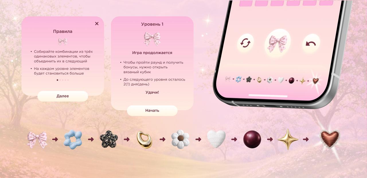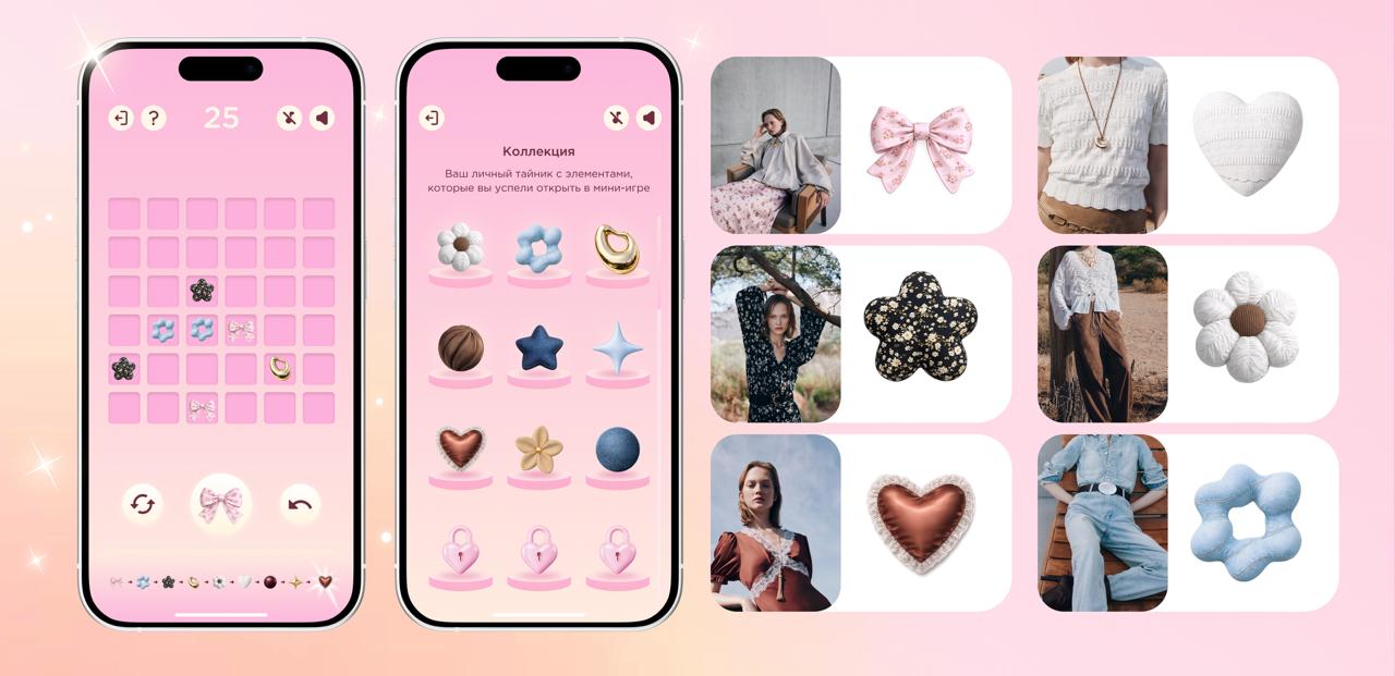 Отдельно хотелось бы отметить работу с дизайном и адаптивность предложенной механики под сезоны не столько календарные, сколько под сезонные коллекции бренда. Все элементы игры представляют собой ассоциативные, фактурные, текстильные и эмоциально-тактильные айтомы связанные с материалами из актуальной коллекции.