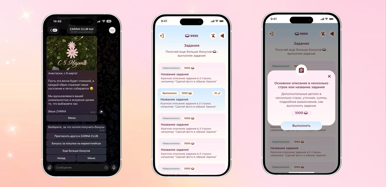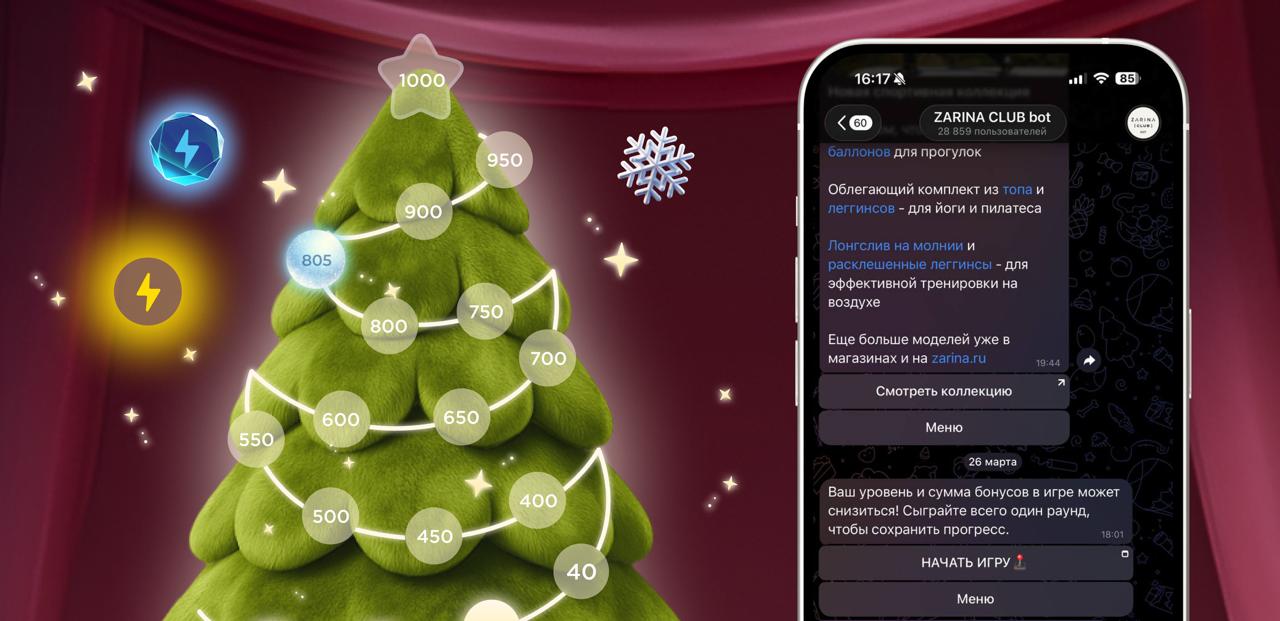 Внедрили в чат-бот бренда геймификацию получения и накопления бонусов интегрированную по API с программой лояльности и мгновенным начислением реальных бонусов от ZARINA CLUB.
