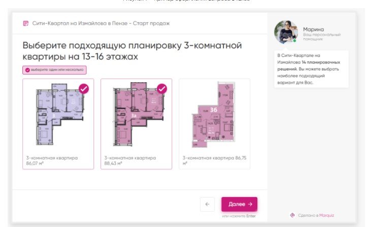5. Ретаргетинг. Кампания нацелена на аудиторию тех, кто уже был на сайте, но не оставил заявку. Этих пользователей было решено вести на квиз, который мы разработали дополнительно к сайту. Так как у нас была вся информация по Сити-Кварталу и картинки всех планировок мы разработали максимально подробный квиз, чтобы собирать более горячие лиды. В квизе есть вопросы по комнатности квартиры, которую хотел бы пользователь и по выбору этажа, в зависимости от ответа на эти вопросы пользователю предлагаются варианты планировок именно этих квартир и именно на том этаже, который он выбрал. Мы предположили, что это должно повысить вовлеченность пользователя при прохождении опроса и привлекать наиболее заинтересованных в покупке людей.