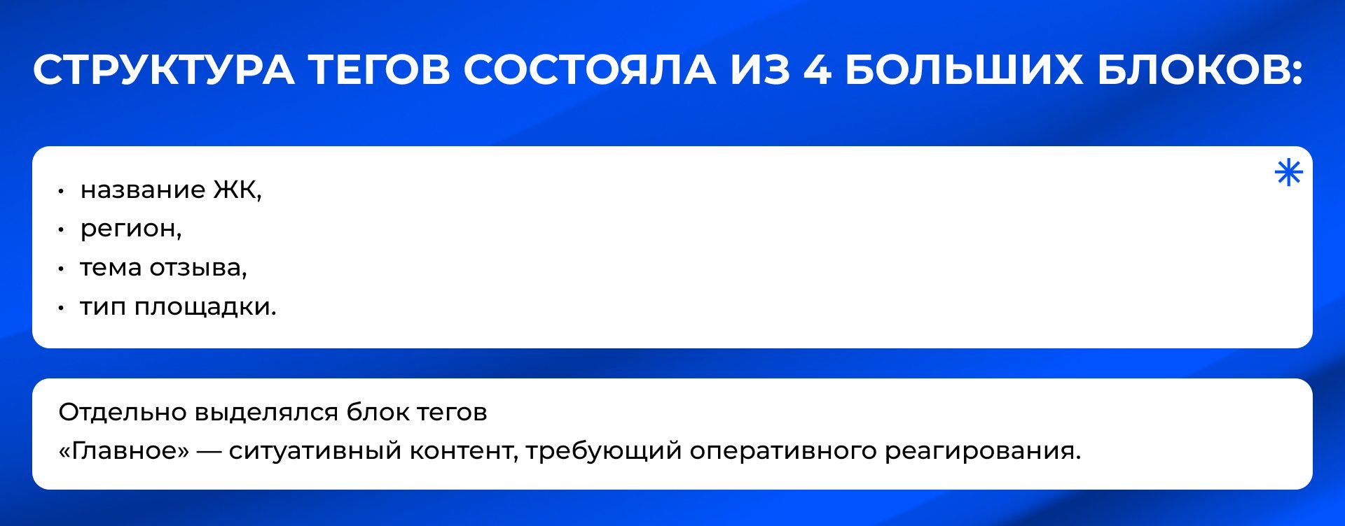 Изменения в сторону негативной тональности по приоритетным тегам (например, «Качество стройки» или «HR») позволяло выявить зарождающиеся неблагоприятные обсуждения и своевременно точечно реагировать на них.