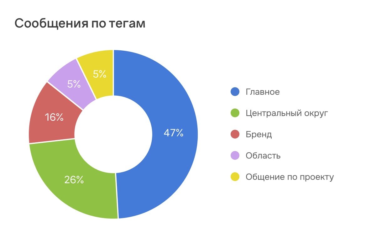 Отчёты с автоматической визуализацией (гистограммами и другими графиками) в целом помогали рабочей группе видеть текущую картину в инфополе и своевременно доносить её до клиента. Например, застройщику стали передавать информацию не только по частотности и тональности упоминаний, но и по их распределению по регионам, которое можно отслеживать как благодаря соответствующему тегированию, так и с помощью отчёта «География».