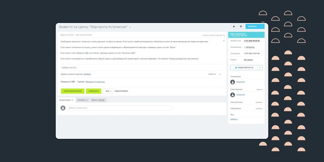 Большинство людей предпочитают не звонить, а писать на WhatsApp или оставлять заявку на сайте, выбрав квартиру заранее. После интеграции с мессенджером сообщения не теряются — они сразу попадают в лид. В этом случае система сама ставит задачу менеджеру о необходимости позвонить или написать потенциальному покупателю. Теперь можно вести переписку, не выходя из Битрикса.
