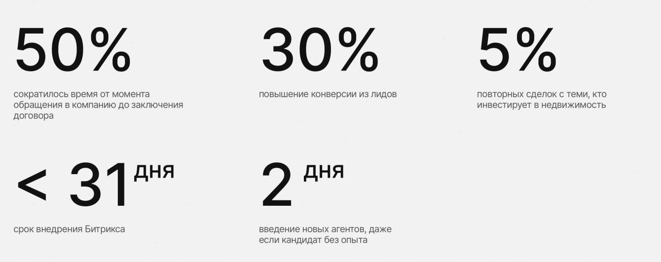 Благодаря Profitbase все сделки переводятся в удобный онлайн-формат; менеджер не теряет заявки на бронирование апартаментов — теперь связь с клиентом стало поддерживать значительно легче; кроме того, у каждого покупателя здесь есть личный кабинет с подробными инструкциями к покупке. Учитывая всё вышеперечисленное, Profitbase в связке с Битрикс 24 позволяет закрывать сделки в полтора раза быстрее.