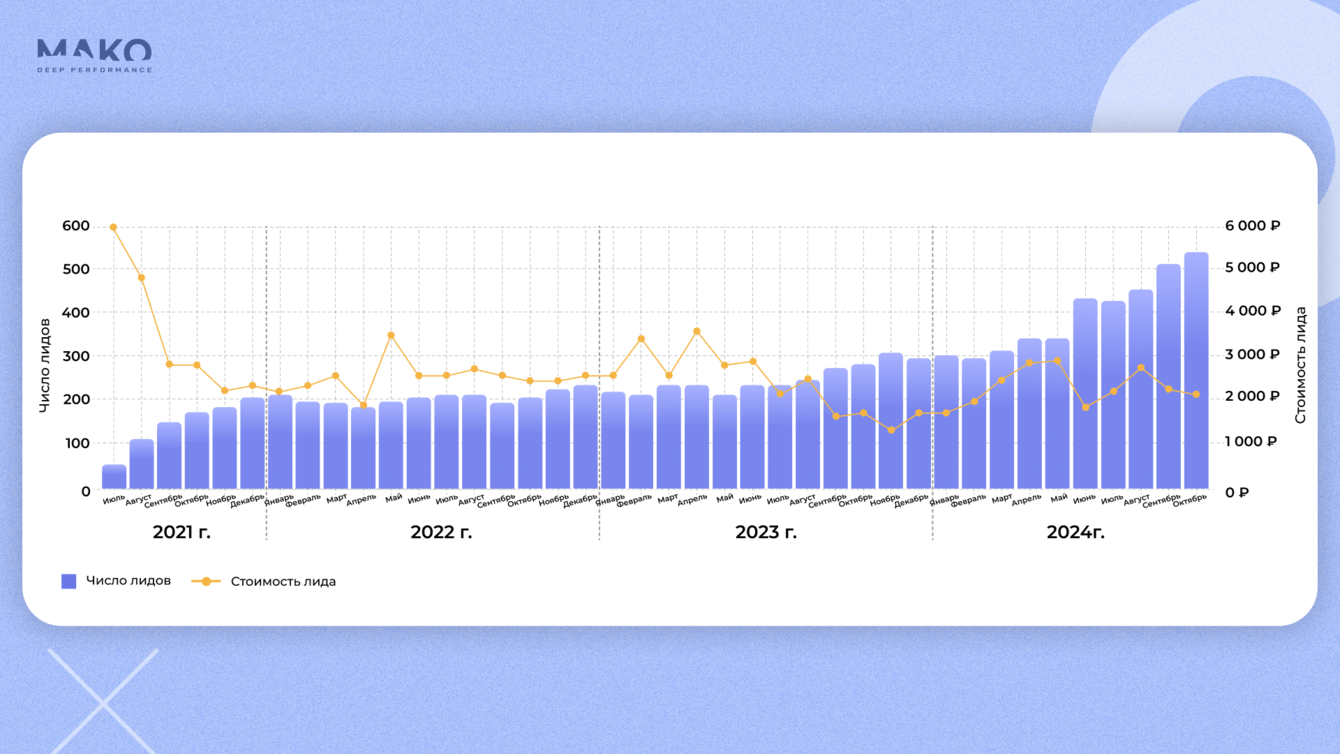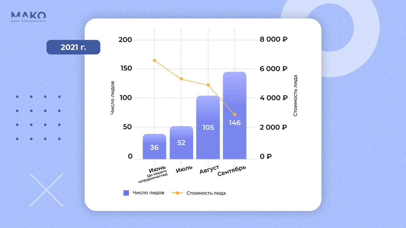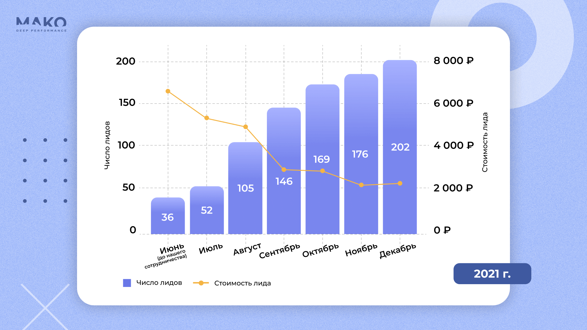 Благодаря этому прорыву уже в декабре 2021 г вышли на уровень: 202 лида за 2265 р. То есть увеличили количество заявок в 5,6 раза, а CPL снизили в 3 раза.