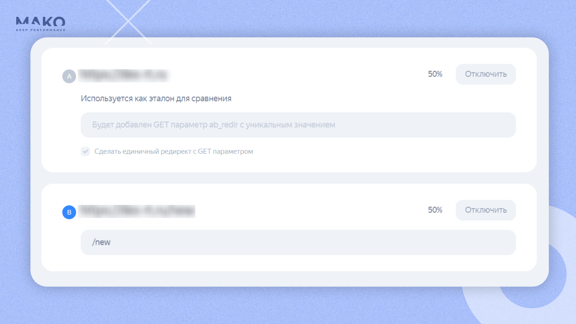 Мы подготовили новый лендинг для теста. Установили скрипты на него и на сайт. Что помогло нам разделить рекламный трафик между сайтом и лендингом поровну.