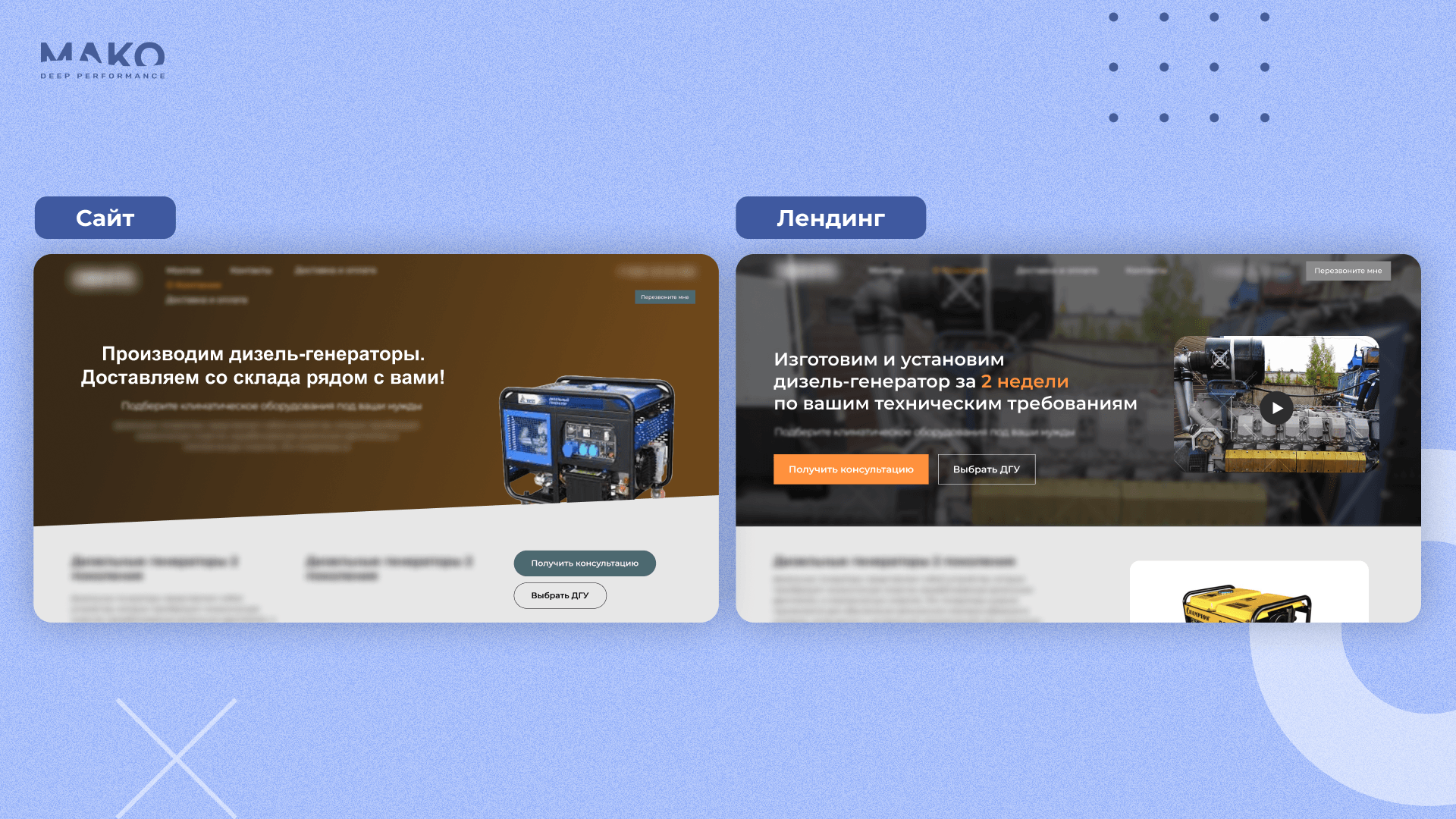 На первых двух экранах сайта в УТП было заложено 4 смысла: какой товар, что он от производителя, территориальная доступность и варианты гарантийного обслуживания. И тут же начинался рассказ о том, где применяются дизель-генераторы. Рядом — 2 формы «Получить консультацию» или «Выбрать ДГУ».