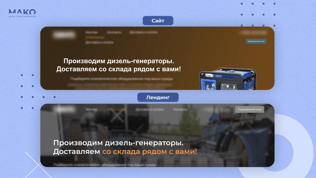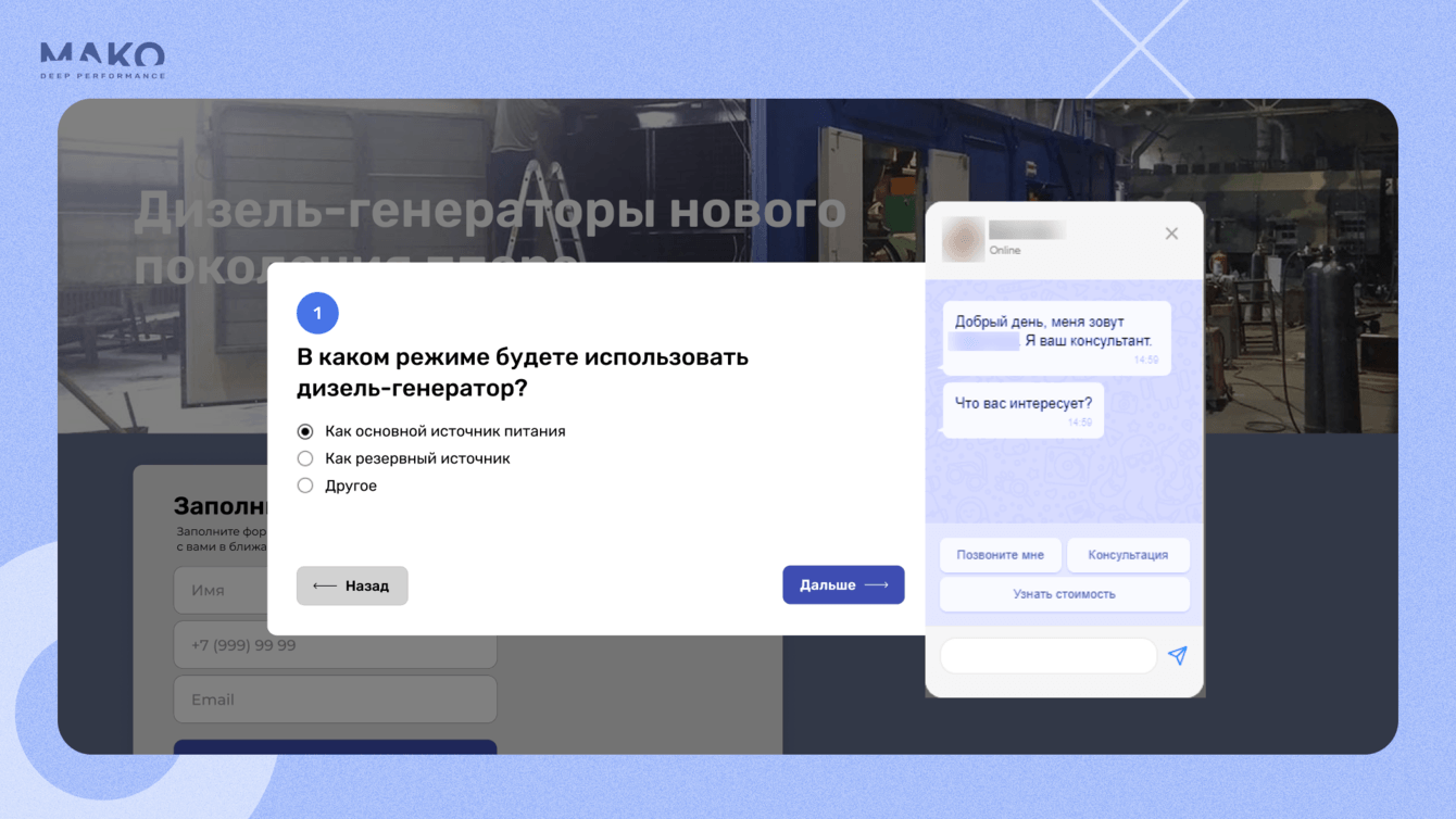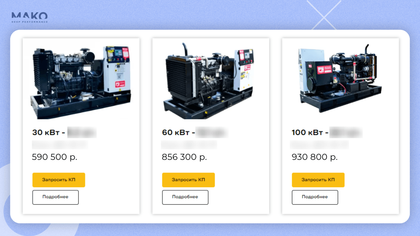 Мы подумали, что на данном этапе еще рано уводить нового пользователя в каталог. Требуется еще больше убеждений и полезной информации о выгодах дизель-генераторов нашего завода. И если максимально рассказать обо всех преимуществах, то конверсия в заявку увеличится.