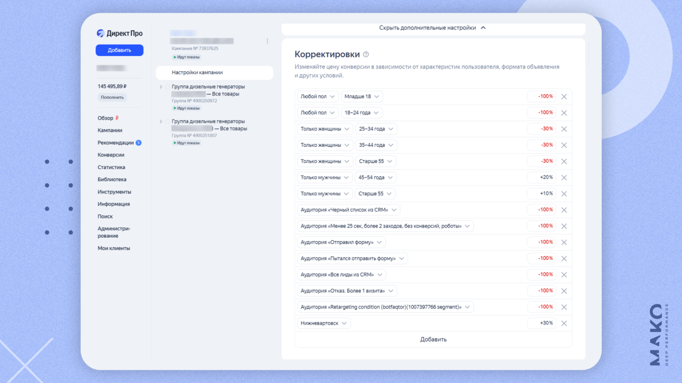 Чтобы добиться этого эффекта мы вручную настраивали специальную цель. Выбирали в Метрике сегмент ЦА, например, человек перешел на страницу дизель-генератора 100 кВт и не оставил заявку. Прописывали в настройках, чтобы алгоритмы показывали ему объявление именно про этот 100 кВт-ный генератор и вели на страницу с ним же. Соответственно, в одной ретаргетинговой РК у нас были сформированы те же группы с сегментацией по мощности оборудования:
