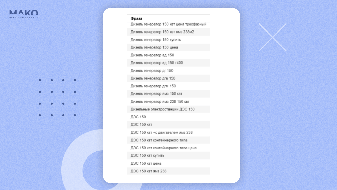 Ювелирно проработали каждый широкий запрос, ведь в этом деле не бывает мелочей. Например, к фразе «Дизель генератор 150» подобрали близкие и целевые низкочастотные запросы, с которыми тоже можно работать: