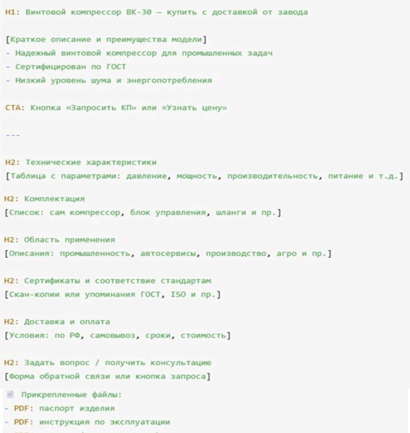 ✔️ формирует «скелет» текста — чёткий план с заголовками, блоками, списком обязательных характеристик и CTA, по которому копирайтеры пишут тексты.