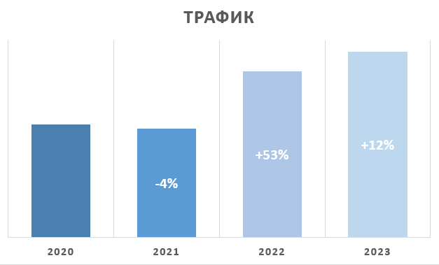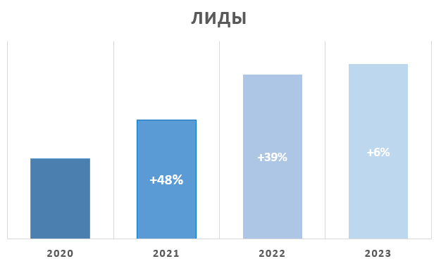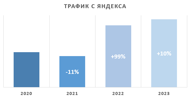 Это общая картина по сайту. Она в некотором роде отражает строительный рынок в эти годы. Нестабильные пандемийные года, затем снижение активности в 2021 году и рост в 2022 и 2023. Мы в эти тренды активно встроились. Продвижение сайта позволило безболезненно пройти слабый год и выстрелить в процветающий год.