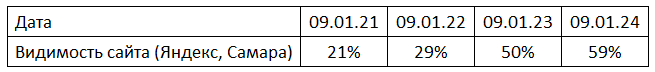 Таблицу по всем 1132 приводить ненаглядно, поэтому показываем видимость сайта. Четыре даты — четыре года:
