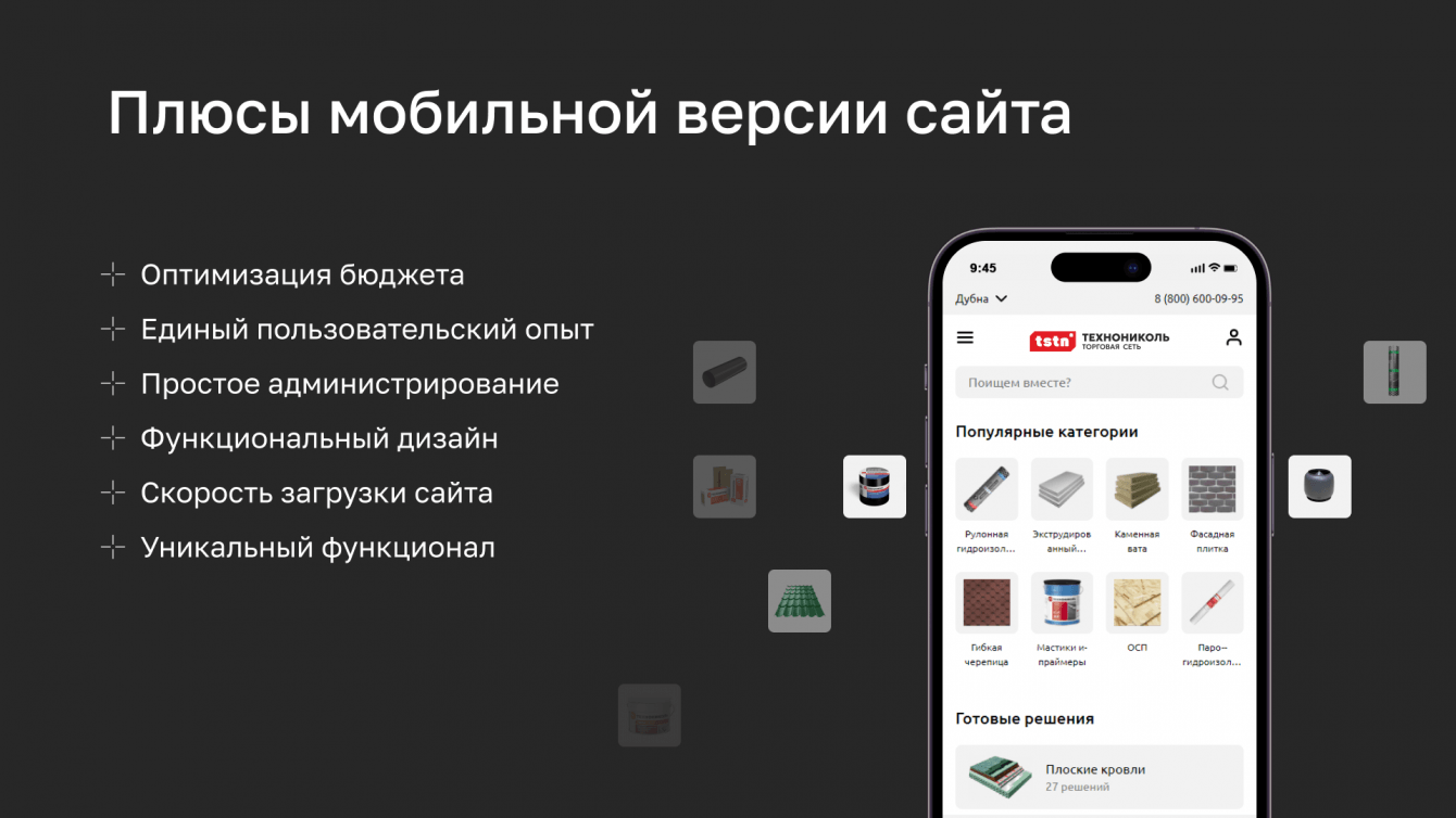 Мобильная версия сайта получила высокую оценку покупателей продукции ТЕХНОНИКОЛЬ и положительный отзыв заказчика.