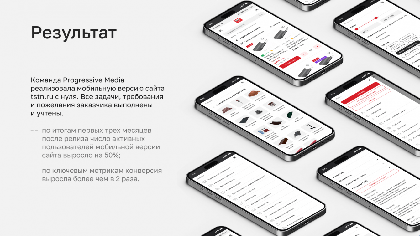 ✓ Перед Progressive Media стояла задача по разработке функциональной мобильной версии сайта для покупки строительных материалов.