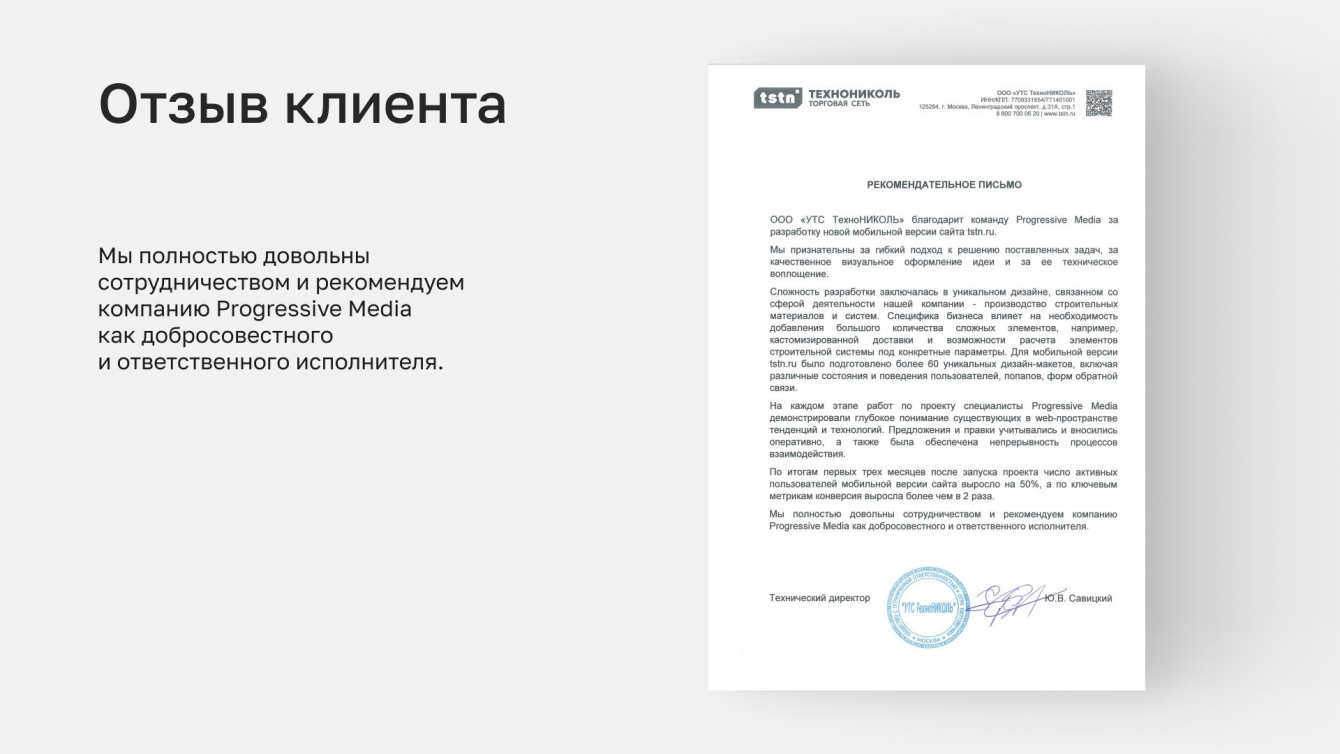 Мобильная версия сайта получила высокую оценку покупателей продукции ТЕХНОНИКОЛЬ и положительный отзыв заказчика.