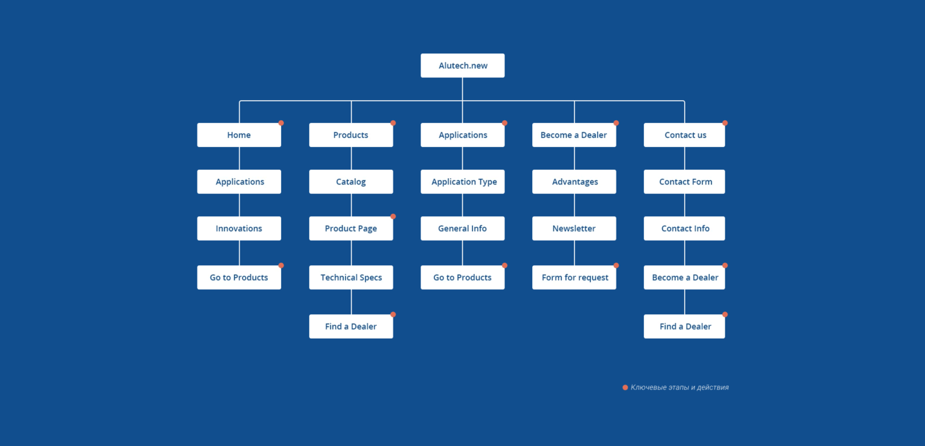 Процесс редизайна мы начали с того, что совместно с командой Alutech провели UX-исследование. На базе юзер сторис и портретов пользователей мы собрали майндмэп, согласно которому был в дальнейшем перестроен сайт.