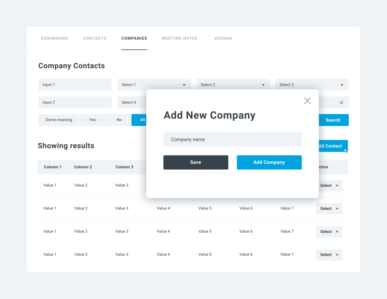 Если компания ещё не внесена в CRM, пользователь может создать её прямо на поисковой странице с помощью кнопки Add Company и не использовать никаких деталей, кроме названия.