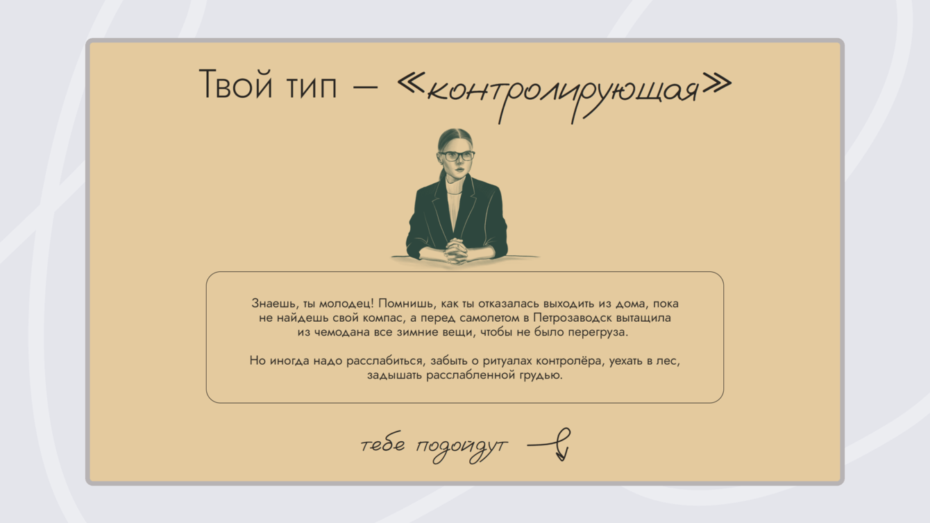 На это клиент создал месседж: «Какой ты путешественник?». Своего рода психологический контекст стал вовлекающим инструментом для тех, которым нужно соответствие развлечений своим внутренним предпочтениям. В игровом формате они могут узнать чуть больше о себе и о новом для себя продукте.