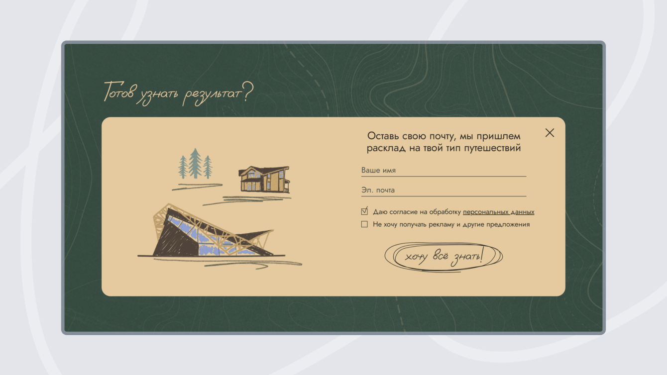 После прохождения теста пользователь может оставить свои персональные данные — опцию сделали вариативной, поэтому окно можно закрыть и следовать дальнейшим инструкциям платформы.