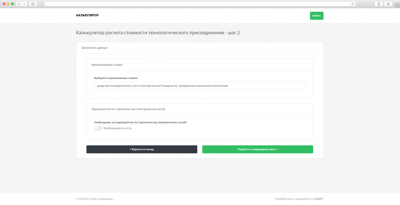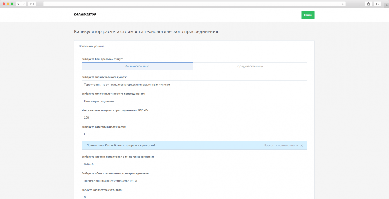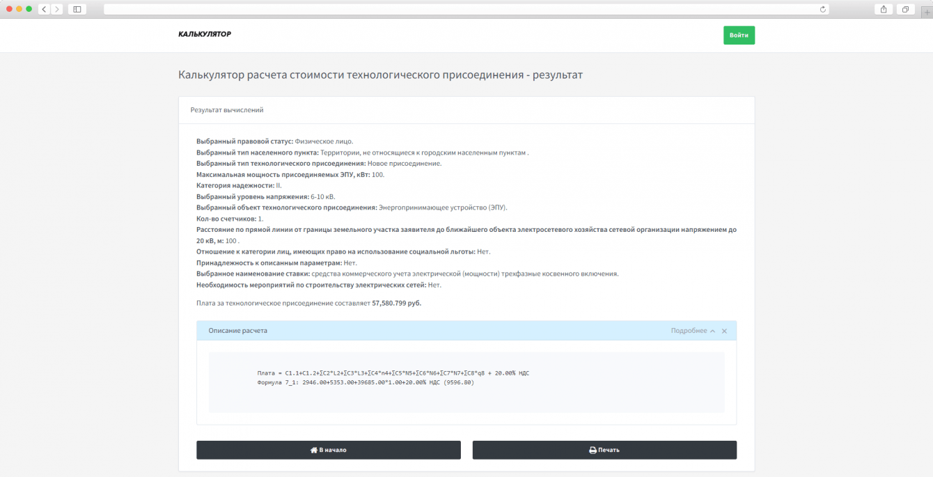 Готовый калькулятор, который автоматизирует процесс расчета стоимости технологического присоединения в зависимости от сотни различных ситуаций, который в базе интегрируется с базой данных пользователей трехстороннего личного кабинета для территориальных сетевых организаций.