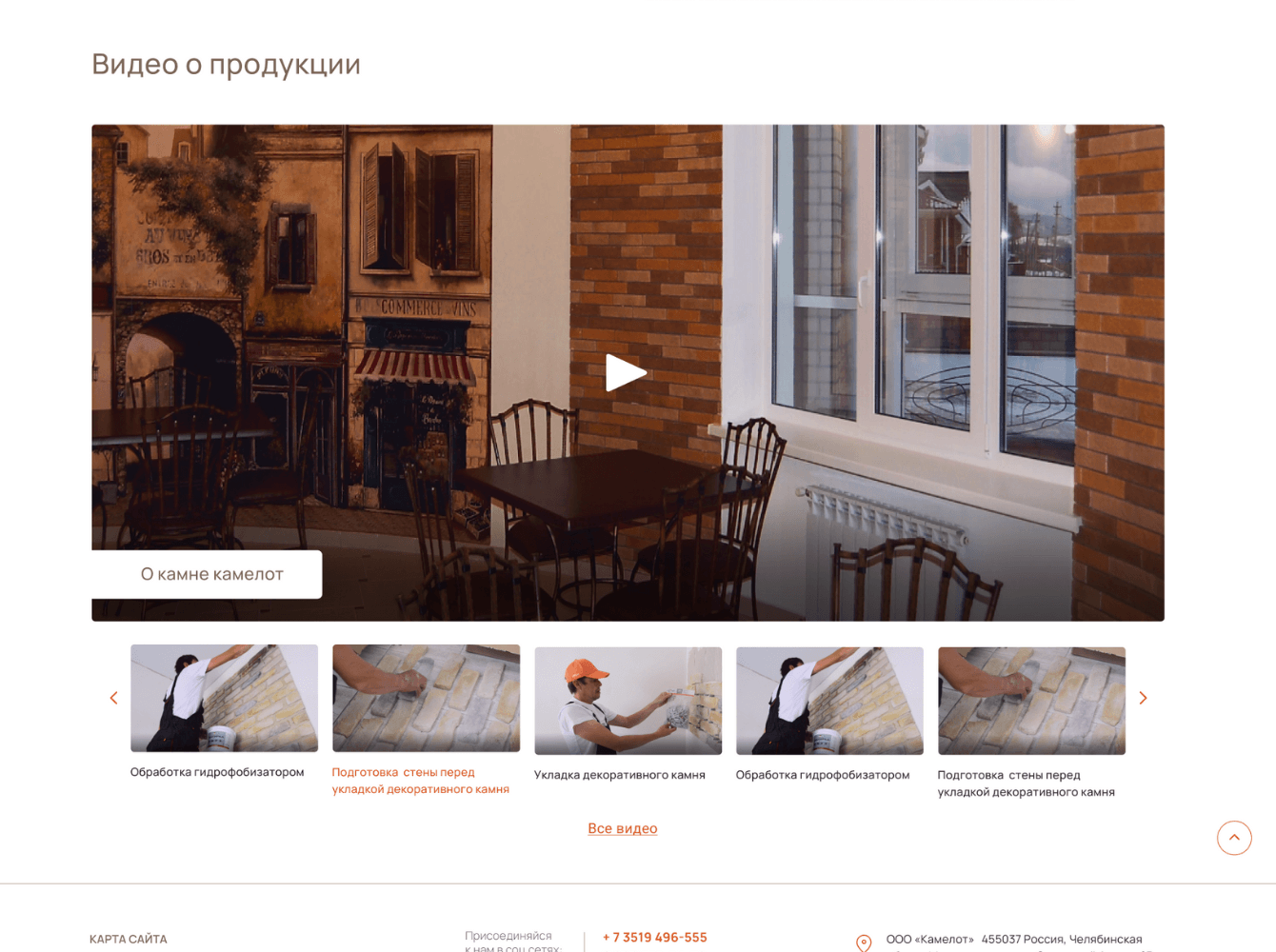 Завершает главную страницу сайта подборка обучающих видеороликов с возможностью просмотра их через популярный видеохостинг. Такое решение позволяет привлечь посетителей, которые знакомятся с процессом и особенностями укладки камня, а также повышает лояльность клиентов к бренду.