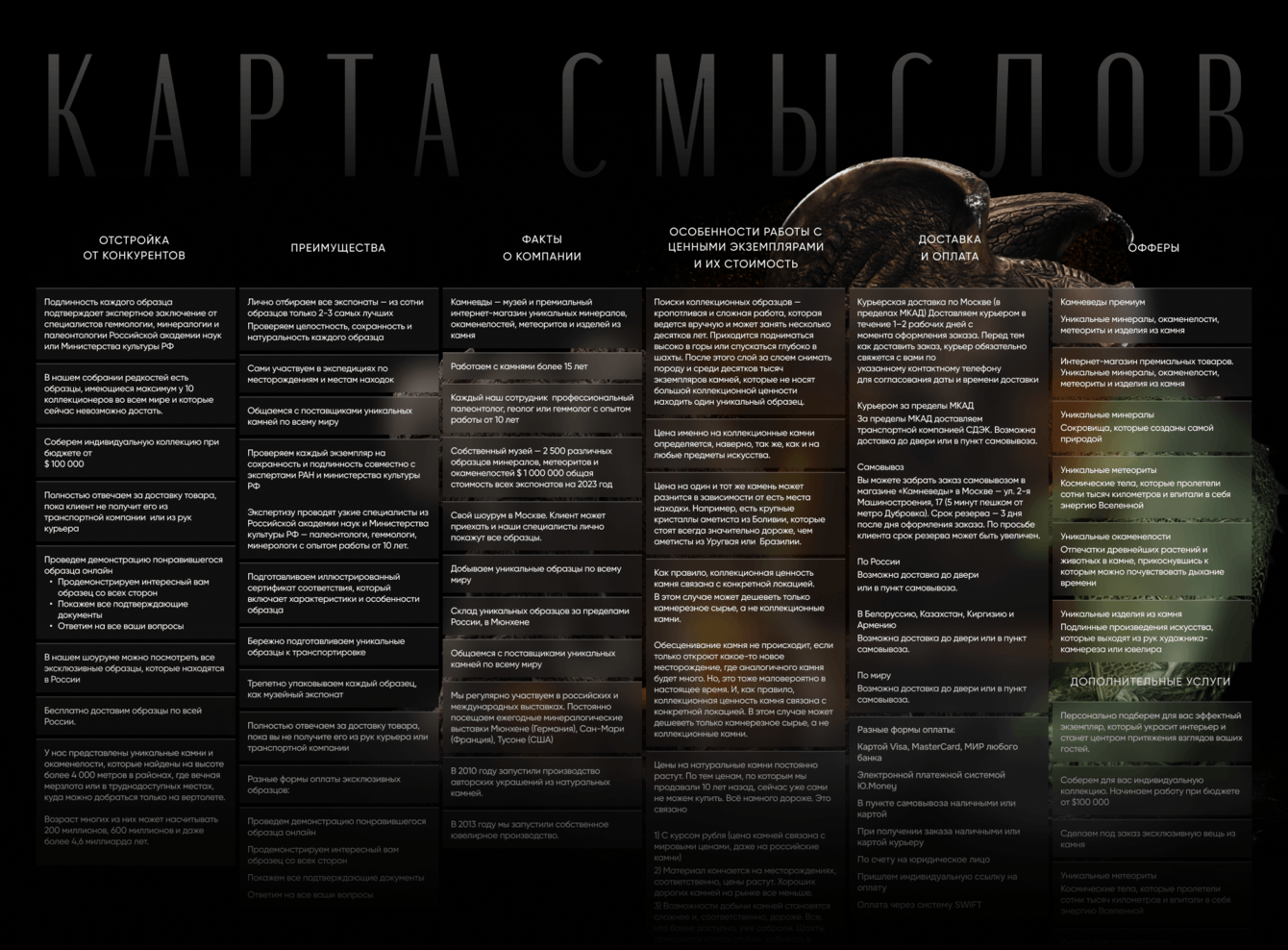 Мы провели с клиентом серию брифов, общее время — 8,5 часов. Нам пришлось погрузиться в тематику геологии и палеонтологии, а также внимательно изучить все материалы, вникнуть во все нюансы мира редких камней, в том числе, как продаются уникальные находки по всему миру. Например, некоторые экземпляры ископаемых нельзя вывозить за пределы России.