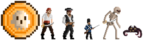 - Бой с врагами (пират, пират‑скелет, гвардеец, краб, щупальца) — разные типы атак (сабля, пистолет, мушкет)