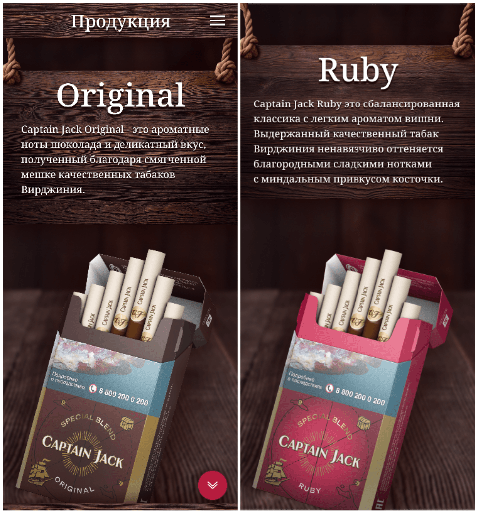 - «Продукция»: описание различных вкусов сигарет