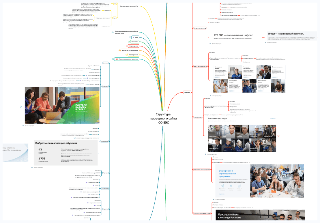 Отталкиваясь от цели и потребностей будущих пользователей сайта, мы продумали структуру, в которой никто не потеряется и каждый найдет свое. Так, попав на главную страницу школьники отправятся смотреть информацию о профессиях и дополнительных курсах, студенты — о магистратуре и практиках, а молодые специалисты заинтересуются стажировками и вакансиями.