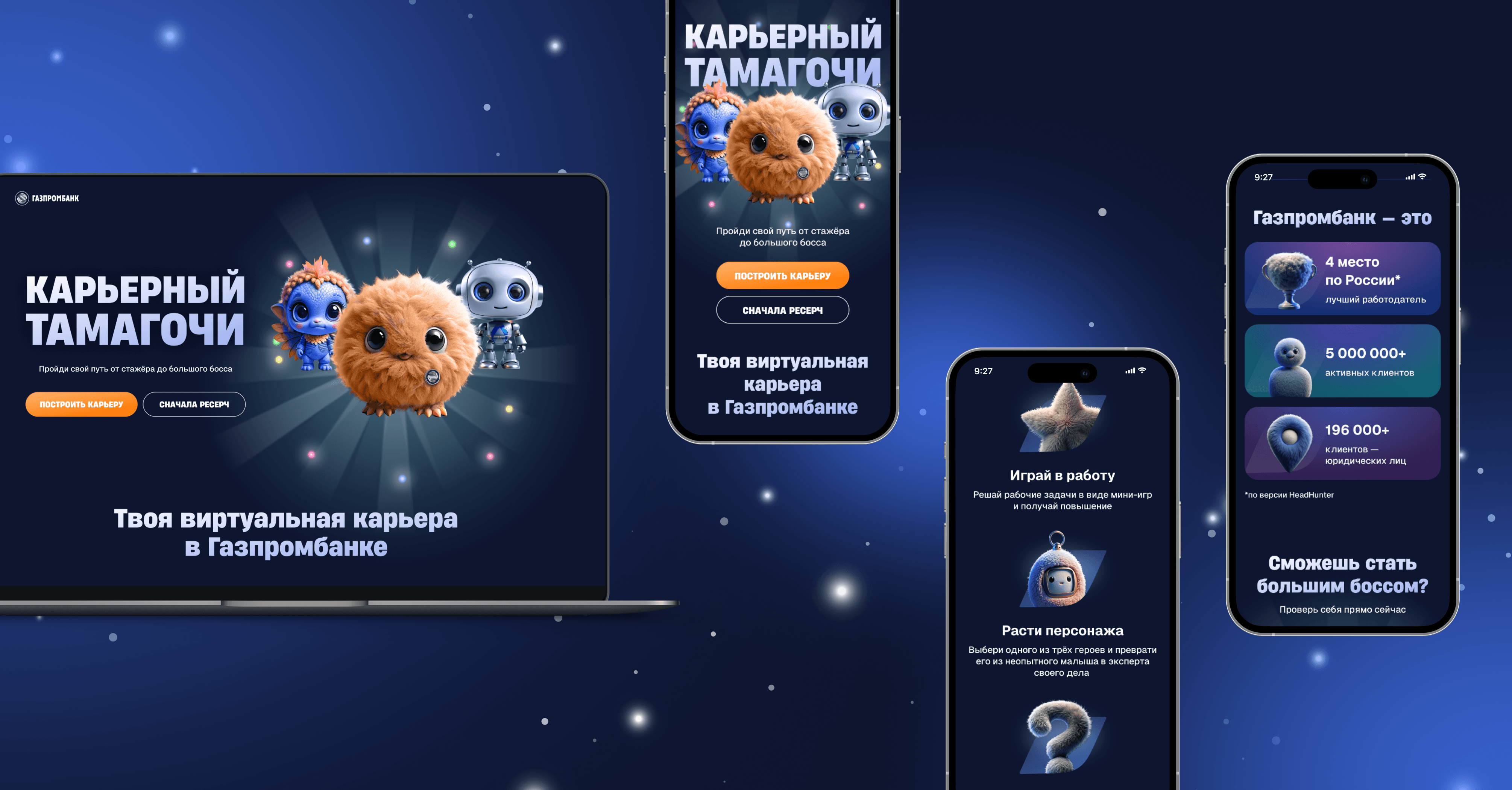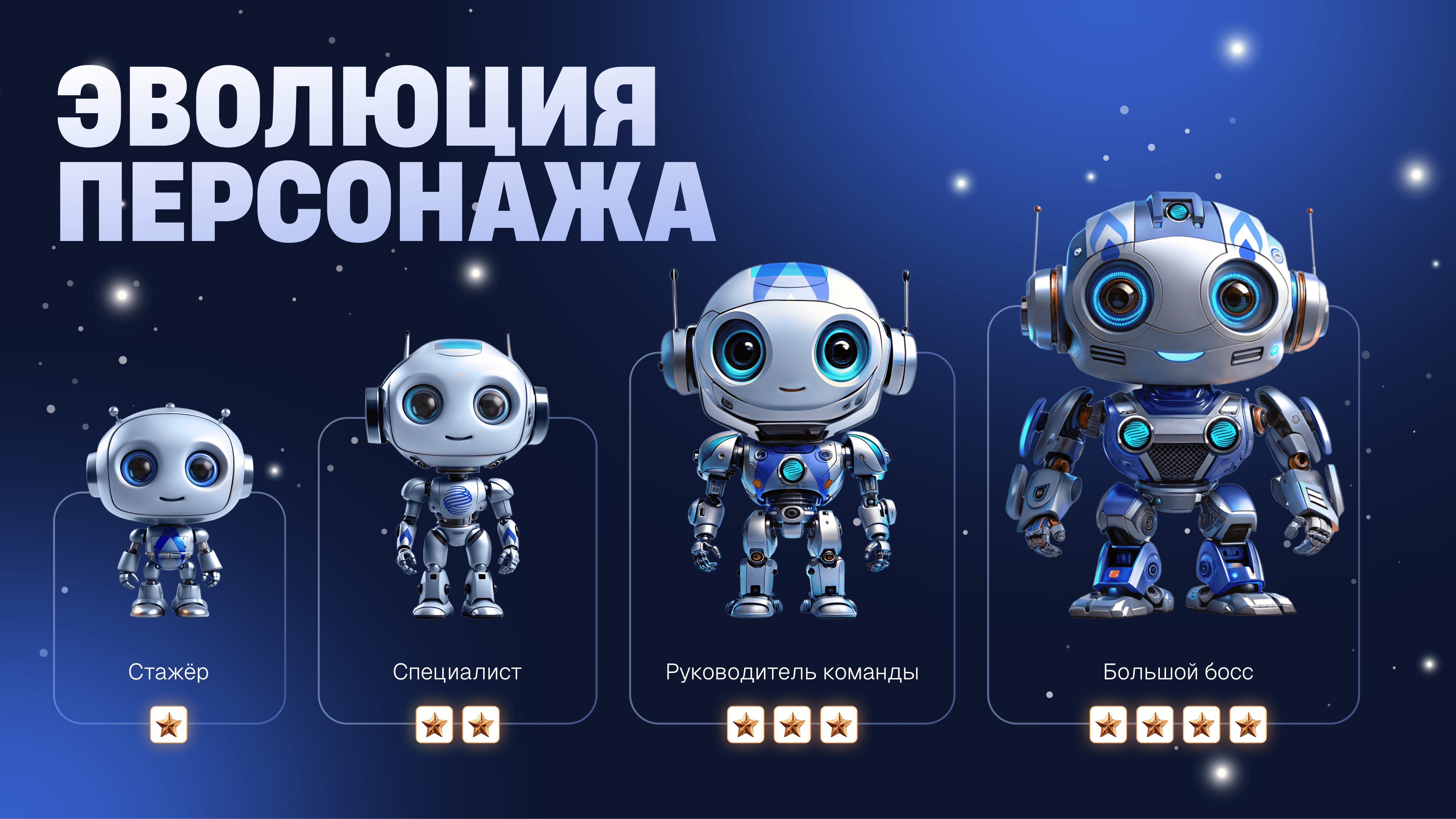Мы вдохновились механикой Тамагочи — ярким примером игры из детства, где рост и прогресс зависят от действий пользователя, и адаптировали эту концепцию под карьерный путь. В нашей версии игрок заботится не о питомце, а о стажере, помогая ему преодолеть все карьерные вызовы и вырасти в большого начальника.