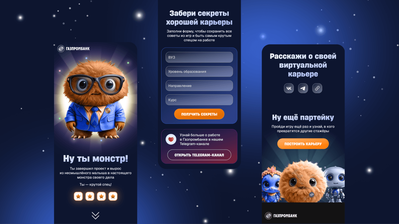После каждой мини-игры игрок получает рекомендации и небольшие карьерные инсайты — как быстрее адаптироваться и увереннее двигаться в рабочих процессах Газпромбанка. А в финале все советы собираются в удобный документ, который можно использовать как шпаргалку для старта в карьере. Так у игрока остаётся не только приятное впечатление от игры, но и полезный ресурс, который можно применять в реальной работе.