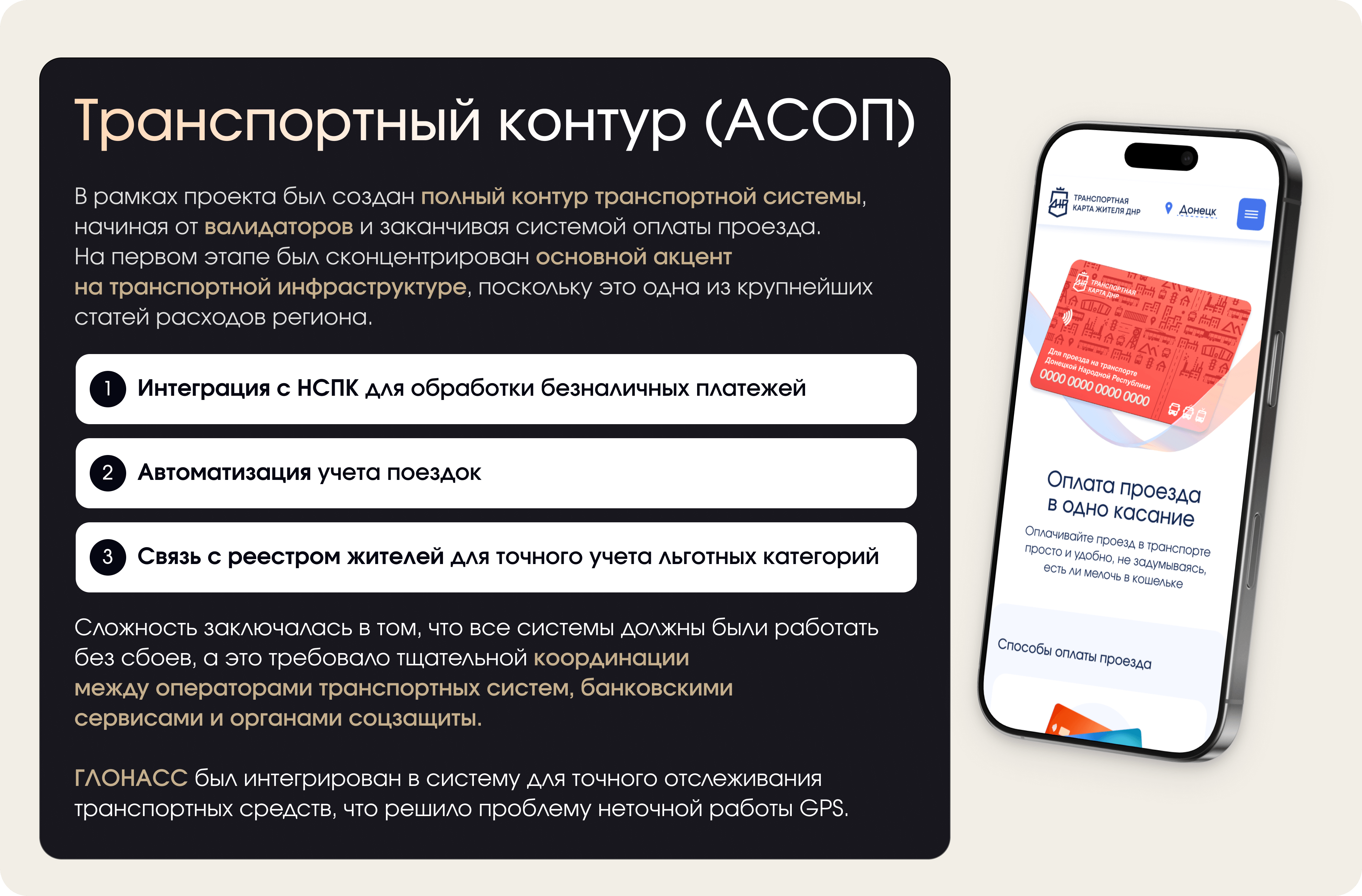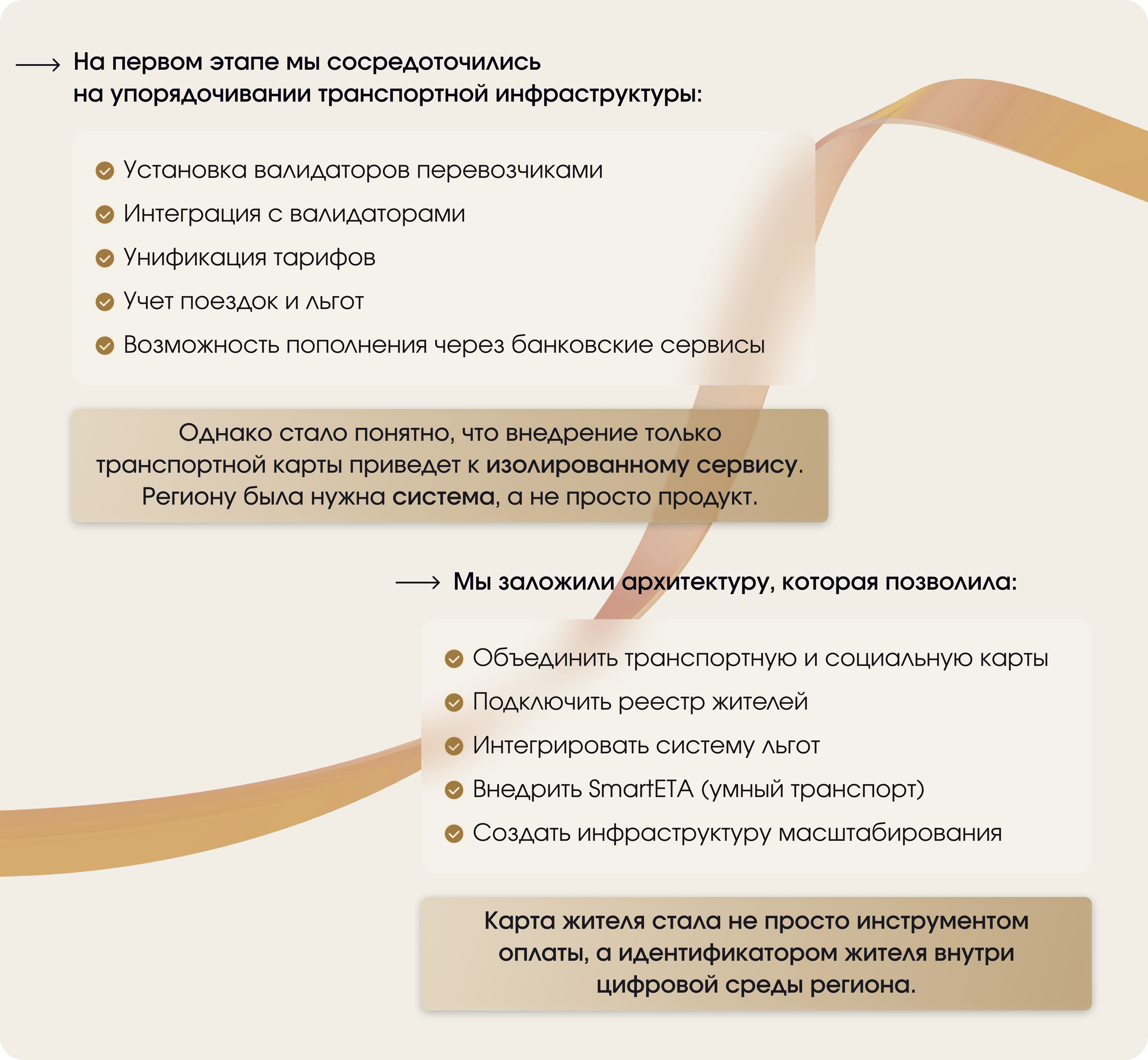 Задача проекта заключалась в создании единой цифровой инфраструктуры региона, объединяющей транспортные услуги, социальные льготы и финансовые операции в рамках одной системы.