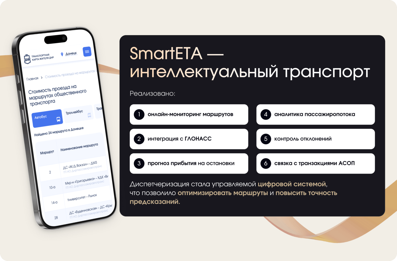 На следующем этапе была разработана и внедрена система SmartETA для оптимизации маршрутов и прогнозирования времени прибытия транспорта. Это улучшило управление пассажиропотоком и позволило повысить эффективность работы общественного транспорта.