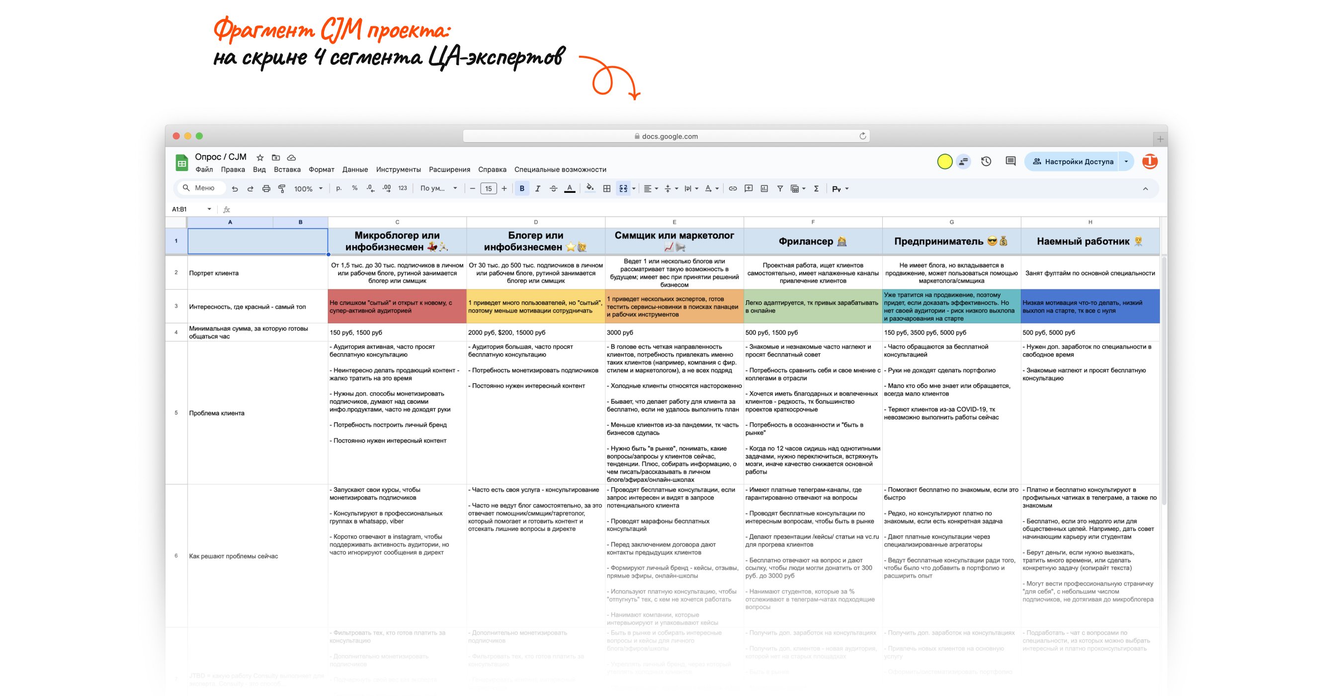 1. Собрали 11 сегментов целевой аудитории — 6 для экспертов и 5 для пользователей. По каждому сегменту составили подробный портрет.