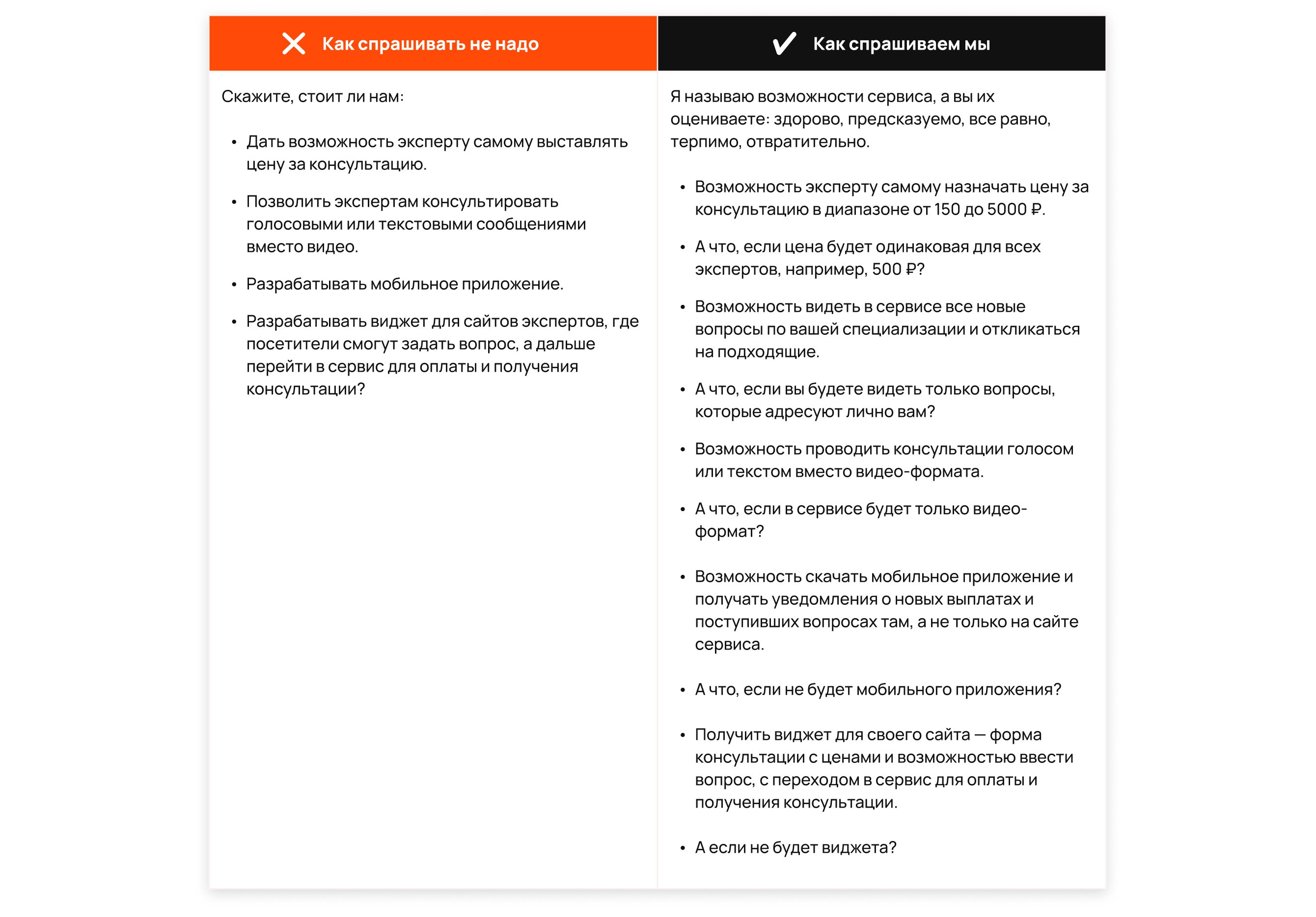 Наши кастдевы всегда глубоки и полны инсайтов. Чтобы избежать ложных или бесполезных данных, мы задаем открытые вопросы и вытаскиваем всю информацию из респондентов. Покажем на примере вопросов про функции сервиса.