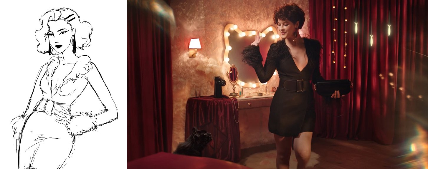 Также был проработан образ героини после преображения, стиль которого отсылает к кабаре-культуре и, соответственно, к названию туши.