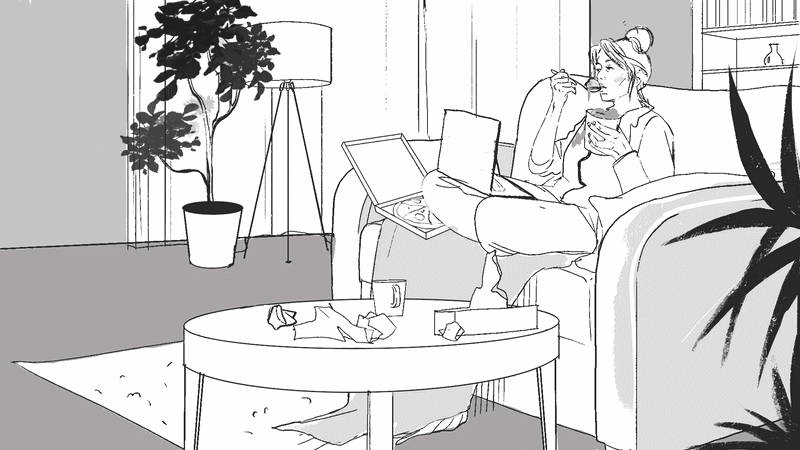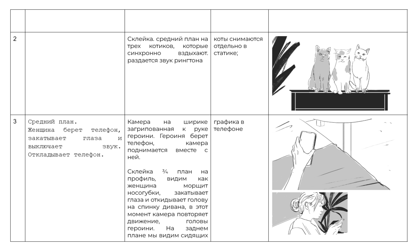 Мы сделали раскадровку. Подробно продумали образ квартиры, отрисовали ширмы, за которыми будет находится тень героини - впоследствии они были реализованы при помощи покадровой 2D-анимации. Это помогло уменьшить число съёмочного материала с котами, но убедить зрителя в их присутствии в ролике.