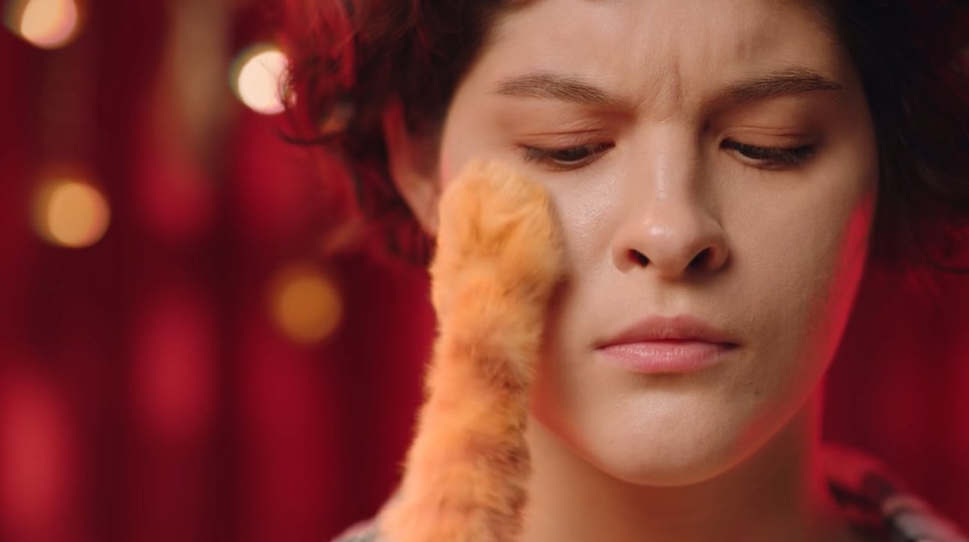 По сценарию Зоидова смотрит сериалы и поглощает мороженое, но коты решают её растормошить и помогают собраться на свидание.