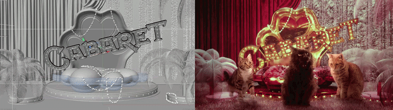 В части кадров сделали CG-фоны за нашими героями, осторожно отделив их от хромакея - наличие шерсти усложняет этот процесс. Также собрали несколько полностью графических сцен, например, с ширмами или с ракушкой-лежанкой, где из съёмочного материала только коты. При помощи цветокоррекции усилили ощущение кабаре-эстетики, присущей квартире героини.